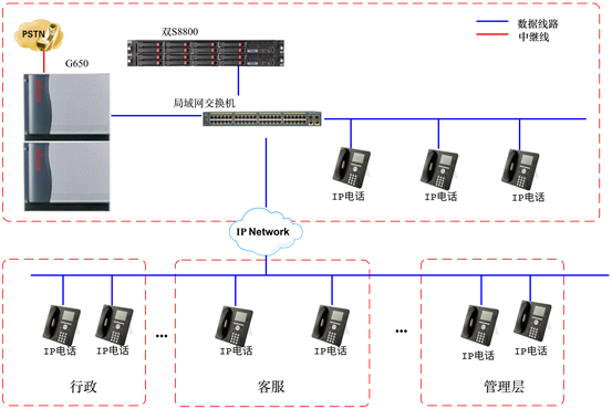 昆侖銀行采用S8800服務(wù)器與G650媒體網(wǎng)關(guān),雙機(jī)熱備份的架構(gòu)進(jìn)行建設(shè)。整套設(shè)備具備高可靠性、高安全性、高容量等特性。采用全I(xiàn)P用戶配置,用戶數(shù)量超過2000人。
